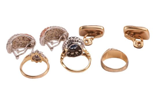 A small mixed group of jewellery items comprising a hardstone pendant in a 9ct gold mount, a 9ct gold sapphire-set wreath brooch, a sapphire and diamond-set cluster ring, in a bi-colour metal mount marked ‘18ct’, size O, a split pearl floral brooch in yellow metal tested as 9ct, and other jewellery items; total weighable: 27.6 grams