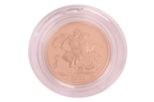 A QEII 2021 Proof Sovereign, in capsule, with outer Royal Mint presentation box and certificate.