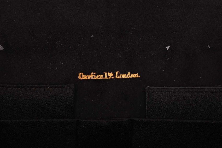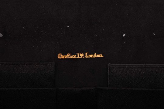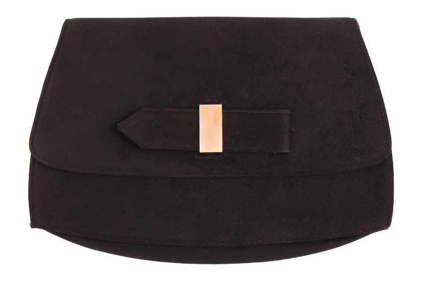 Cartier - an evening clutch bag in black suede, circa 1960s, of rounded rectangular shape with gussets to the sides, flap closure, lined with black silk, multiple compartments with a fitted mirror and fitted detachable envelope pouch, signed 'Cartier Ltd. London', gold-tone hardware. W26.0 x H17.0 cm.