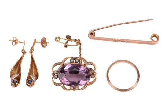 A small collection of jewellery items, to include an amethyst and seed pearl brooch in yellow metal marked '9ct', a bar brooch engraved with initials in yellow metal stamped '9ct', a 9ct gold ring in size Q, and a pair of drop earrings set with sapphire and diamonds in 9ct gold; total weight of items 13.6 grams. (4)