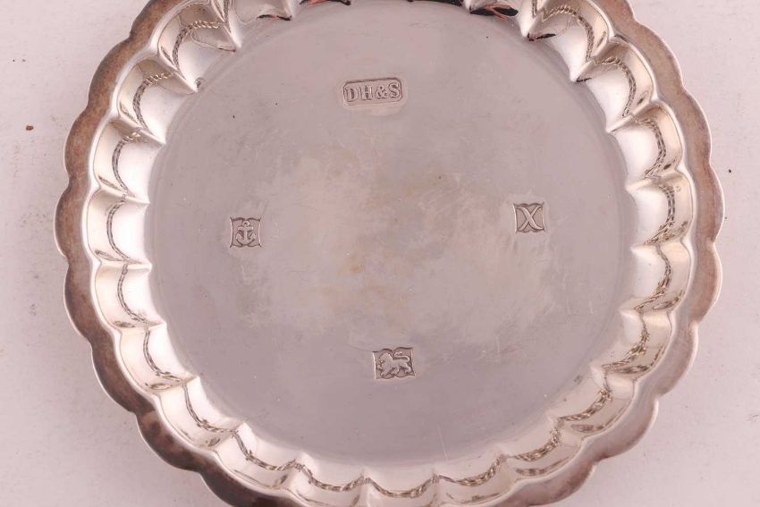 A large, drawn silver fruit stand with a cast and applied pipe rim to the lobed edge, Sheffield 1971 by James & William Deakin, with pierced border, 26 cm wide, together with a small agglomeration of silver items including cream hugs, pepper mill, bonbon dishes, bottle coasters and other items. 24.6 ozt / 697 grams gross weight of weighable silver.