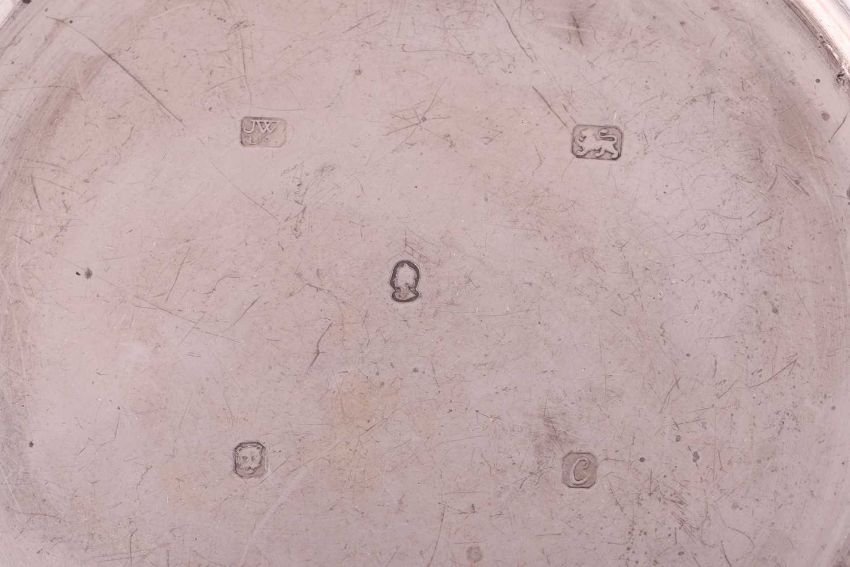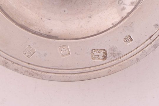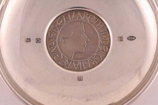 A H.M.Queen Elizabeth II Silver Jubilee circular tray, 15cm, two Alms-type circular pin trays, a modern Armada dish and a strut clock with silver frame. 13.8 ozt, 430 grams gross weight of weighable silver.