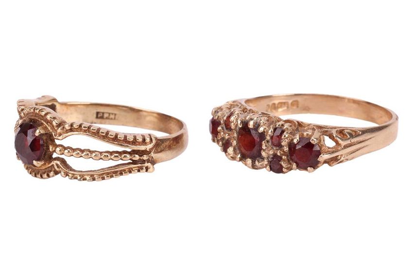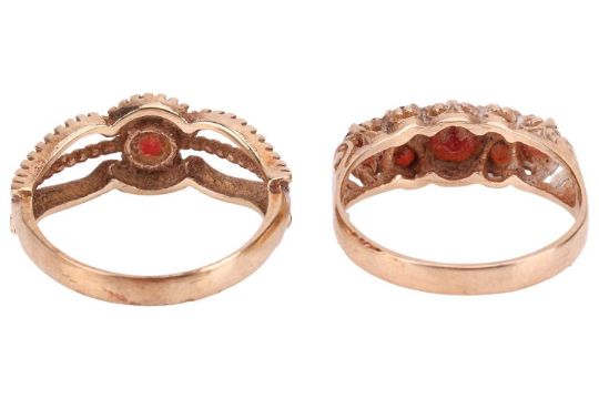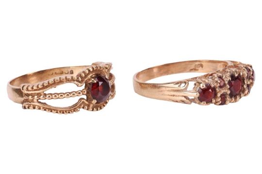 Two garnet-set dress rings in 9ct yellow gold; one in the style of a half-hoop ring sized P, and another solitaire in size P; total weight of items 5.1 grams. (2)