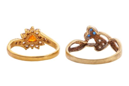 Two rings, comprising a paste-set floral cluster ring, in a 22ct yellow gold mount, size M, together with a paste-set heart crossover ring in a yellow metal mount marked ‘585’ with maker’s mark ‘Altinbas’, size P1/2; 6.0 grams (2)