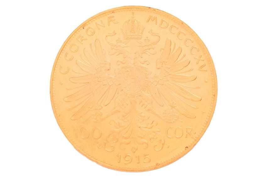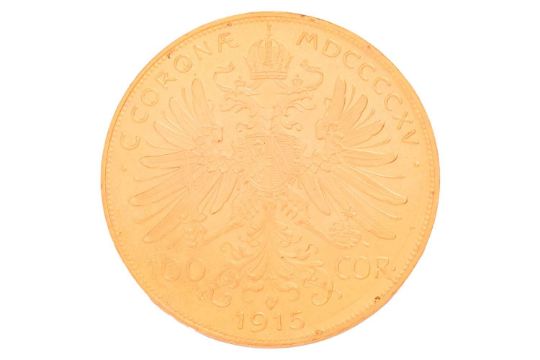 A 1915 Austrian one hundred corona gold coin, bearing the bust of Emperor Franz Joseph I, 33.9 grams, 34.6 mm diameter.