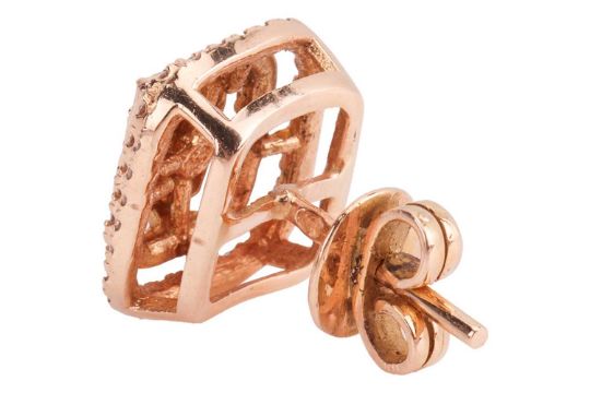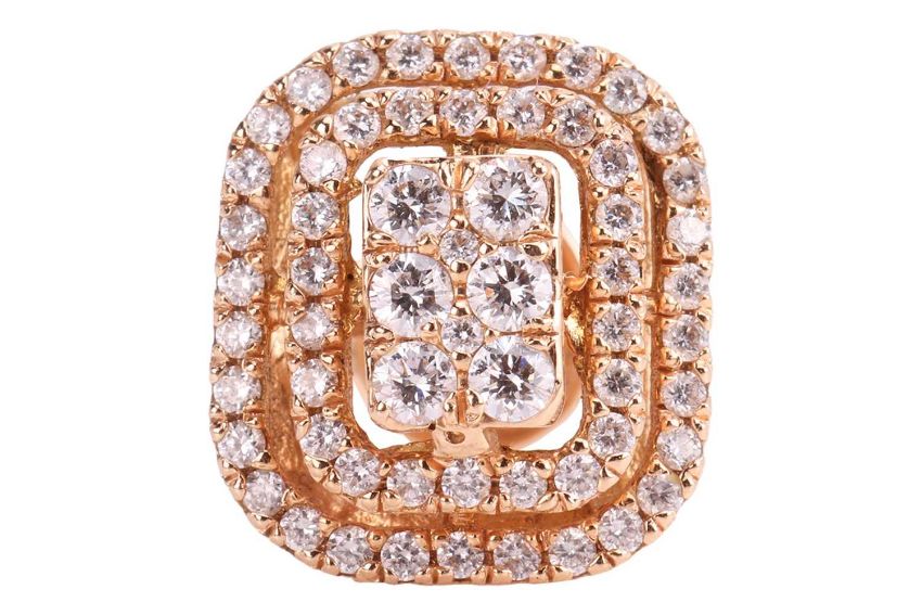 A single diamond-set stud earring, comprising a central rectangular cluster of eight grain-set round brilliant-cut diamonds of two sizes, encircled by two rows of brilliant-cut diamonds, earring head measuring 13.2mm x 11.9mm x 7.6mm, to post fitting with butterfly back, in yellow metal surface testing as 18ct, 3.0 grams.