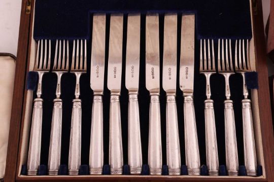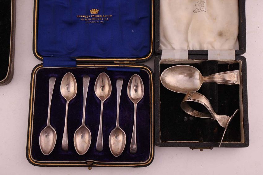 A cased set of silver fruit knives and forks, Sheffield 1925 by Harrison Brothers, all with loaded handles, together with a Goldsmiths & Silversmiths Christening set, together with other assorted cased silver flatware, 11.4 ozt / 323.1 grams gross weight of weighable silver (fruit set excluded)