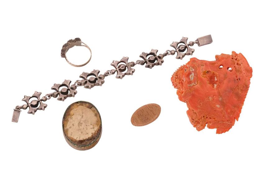 A group of items to include; a piece of coral carved with a scarab beetle and leaves, 37.0g, a paste-set link bracelet in unmarked white metal, a hairwork mourning brooch (back and brooch fittings deficient) and a ring set with red pastes.
