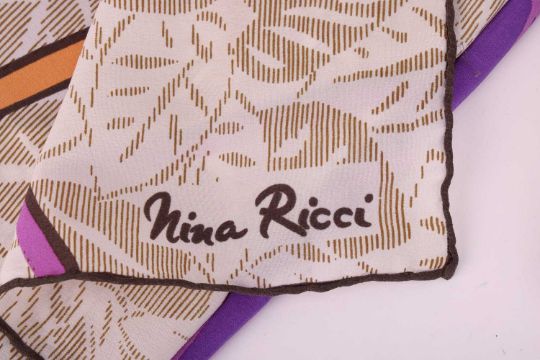 A collection of six designer scarves; comprising a Burberry silk scarf in butter yellow and tartan border, a Burberry large silk scarf in tartan pattern, a Burberry cotton triangle scarf with tartan print, a Yves Saint Laurent logo square scarf in black and cream, a Ferragamo animal print scarf with fraying edges, and a Nina Ricci purple floral scarf. (6)