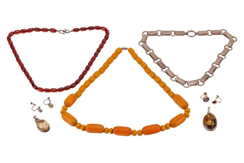 A small group of mixed jewellery items comprising an oval bezel-set burnt amber pendant, an oval citrine pendant, a butterscotch amber bead necklace, an oval red bead necklace, a white metal necklace, the rectangular links with engraved floral detailing, a pair of paste-set floral screw-back earrings, a single synthetic colour-change sapphire screw-back earring, in a yellow metal mount marked ‘9ct’ and another single paste-set earring in a yellow metal mount marked ‘9ct’; 134.5 grams (8)