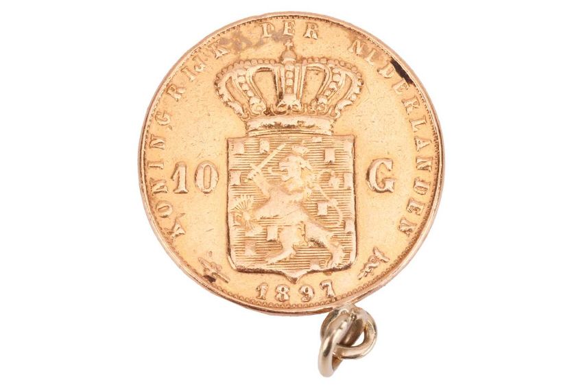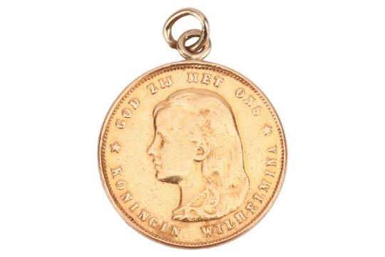 A Dutch 10 Guilder gold coin, 1897, Utrecht, Netherlands, mounted for a chain 6.9 grams.