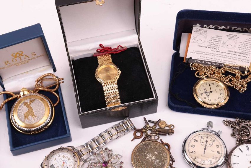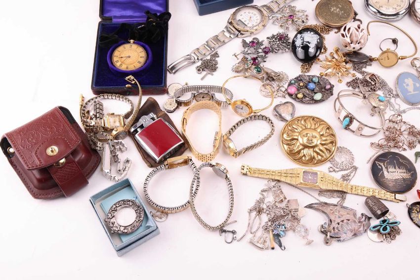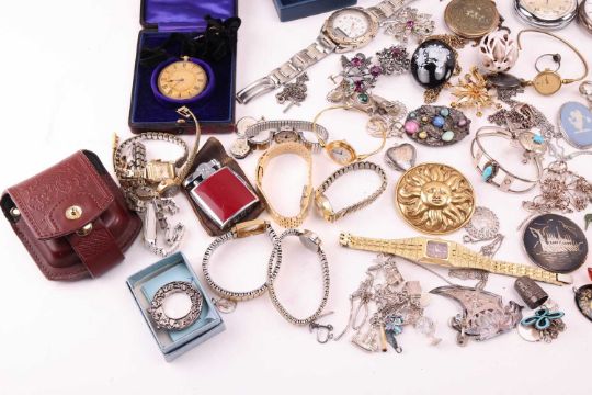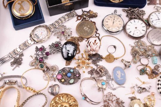 A large group lot of silver and costume jewellery; to include a double row cultured Akoya pearl necklace with a white metal clasp, a quantity of freswater pearl and imitation pearl necklaces; a Metropolitan Museum of Art sunburst design brooch cum pendant; pocket watches and wristwatches by Seiko, Sekonda and others; a quantity of white metal and silver chains and a small group of earrings and broken jewellery testing as 9ct and 14ct, weighable 5.5g, together with other costume jewellery and objects.