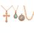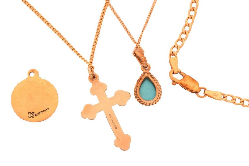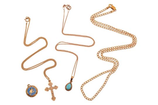 A small collection of 9ct gold jewellery; to include a teardrop turquoise cabochon in a conforming bezel on bail, British hallmarks, on a curb link chain marked '375'; an engraved cross pendant with British hallmarks, on a curb link chain marked '9ct'; an enamel charm in 9ct; and a curb link chain stamped '375'; total weight of items 11.3 grams. (4)