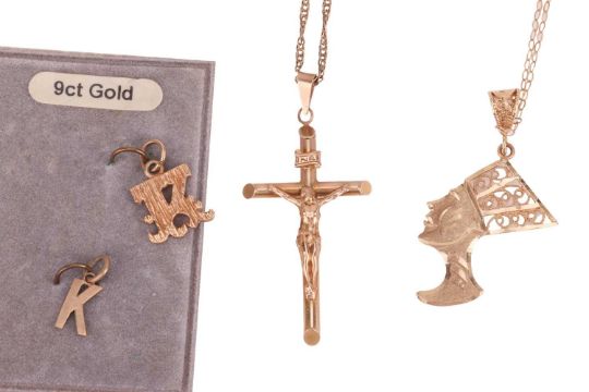 A mixed group of jewellery items comprising a 9ct gold crucifix pendant, to a 9ct gold twist link necklace, a Nefertiti pendant in yellow metal marked ‘9K’, to a trace link chain marked ‘9K’, a yellow metal snake link necklace marked ‘375’, and two ‘K’ pendants, one hallmarked 9ct gold and one marked ‘9ct’; 7.5 grams (5)