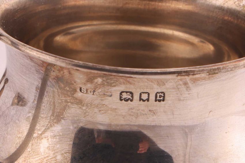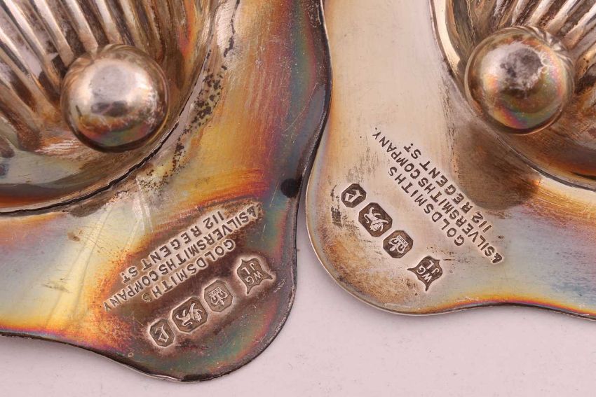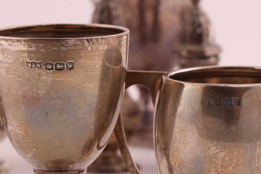 A small agglomeration of silver items, including scallop shell butter dishes, a 20th-century two-handled Quaich-style bowl (not Scottish) with flat section handles, a pair of 19th-century Scottish silver sauceboats, a pair of trophy form sweet meats, and other small items of silver. 50.4 ozt / 1567.6 gross weight of weighable silver.