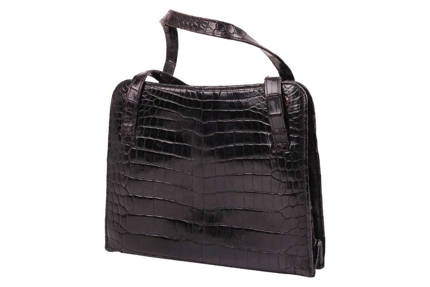 Cartier - a handbag in black crocodile skin leather, circa 1960s, of rectangular shape, with double top handles, calf leather lined, kisslock closure, multiple compartments, signed 'Cartier Ltd. London', W25.0 x H18.5 x D7.0 cm.