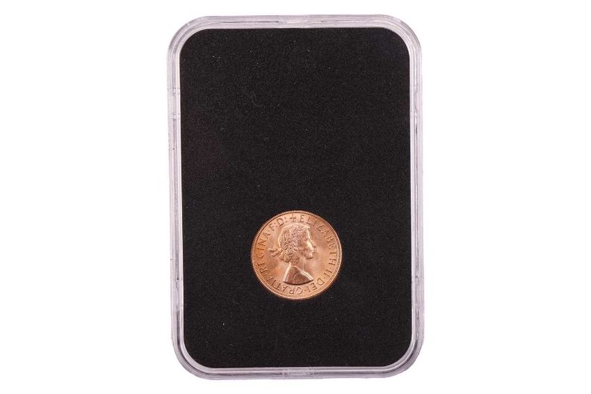 A 1957 Queen Elizabeth II Sovereign, (the first QEII issued Sovereign), in capsule with outer presentation box and certificate.