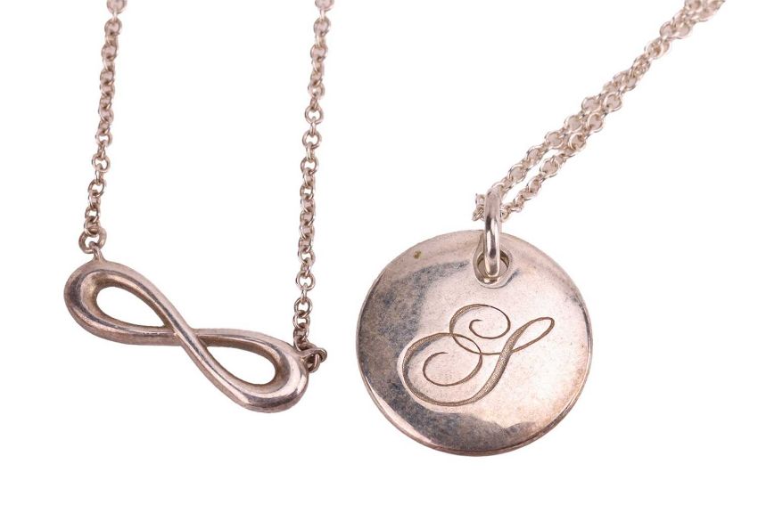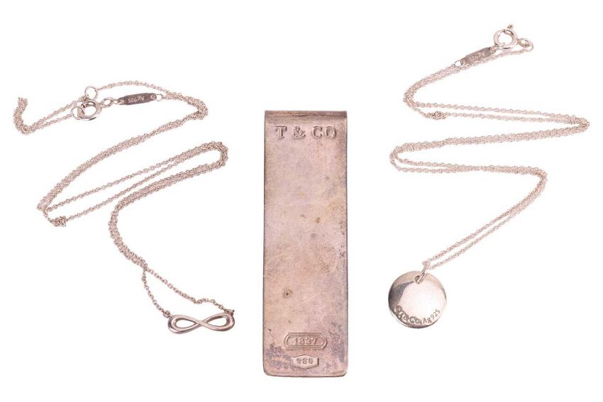 Tiffany & Co. - an initial pendant on a 41.0 cm long fine cable link chain in white metal marked 'Ag 925', an infinity sign necklace on cable link chain in white metal marked 'Ag 925' measuring 45.0 cm long, and an 1837 money clip stamped '925'; total weight of items 29.6 grams. (3)