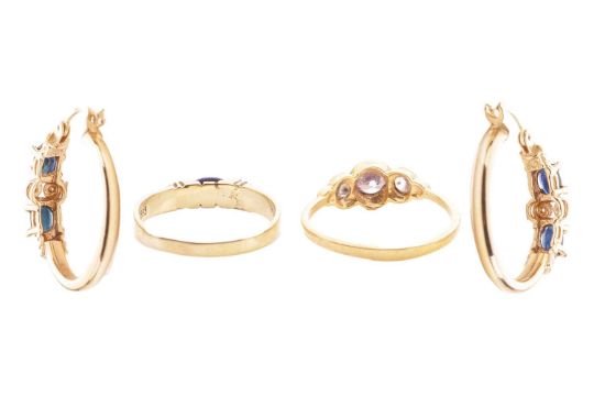 A small group of jewellery items comprising a pair of sapphire and diamond-set hoop earrings, in yellow metal marked ‘14K’, together with a three-stone paste-set ring in a yellow metal mount marked ‘750’, size P1/2, and a blue hardstone ring in a yellow metal mount marked ‘585’, size O1/2; 8.5 grams (3)