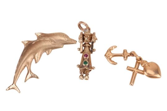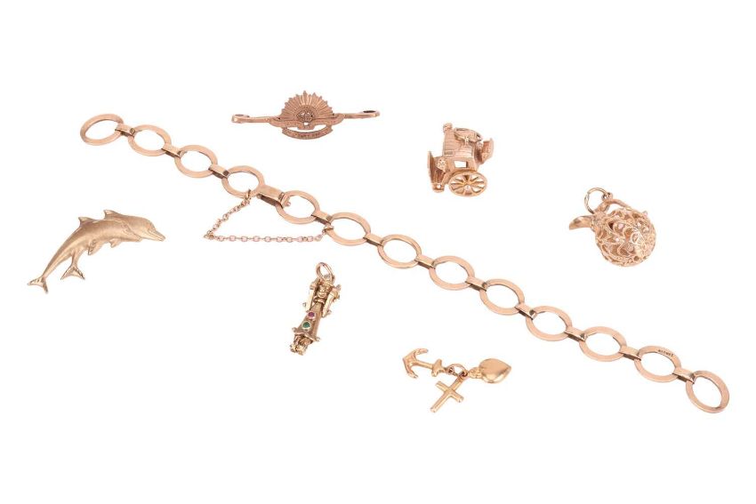A bracelet and a collection of charms, the bracelet formed of thirteen oval-shaped links connected by smaller oval-shaped links, completed with a fold-over clasp, bracelet marked ‘9ct’, (bracelet is broken), together with a number of charms, including a gem-set doll charm surface testing as 14ct, a carriage charm surface testing as 9ct, a jug charm surface testing as 9ct and a charm featuring a cross, heart and anchor surface testing as 18ct; together with an Australian Military bar brooch surface testing as 14ct and a dolphin brooch surface testing as 9ct; Gross weight 24.7 grams.