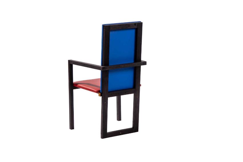 Terence Conran: 'Homage to Rietveld Prototype Chair', a unique item, designed by Conran circa 2012, stained oak and coloured leather, 98 cm high x 53.5 cm wide, the seat 42 cm high x 43 cm deep.