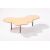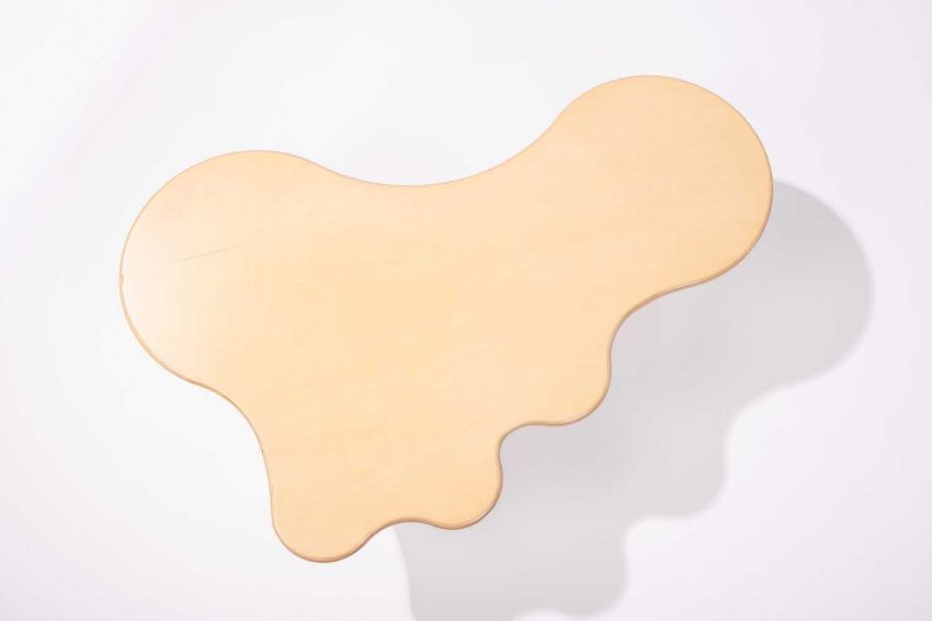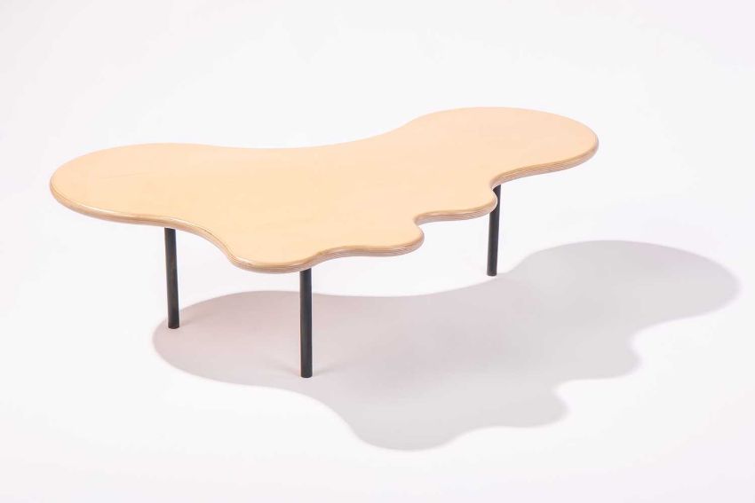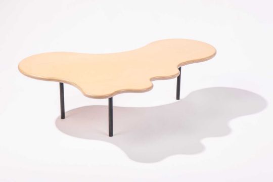 A shaped ply coffee table, on three legs, 31 cm high x 109 cm x 75 cm.