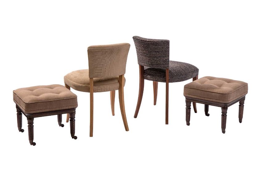 A matched pair of Benchmark Furniture dining chairs, in oak and walnut, with overstuffed seats, 81 cm high x 51 cm wide, the seats 51 cm high x 42 cm deep, together with a pair of Benchmark dark walnut footstools, button upholstery, on castors, 41 cm high x 45 cm wide.