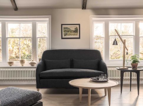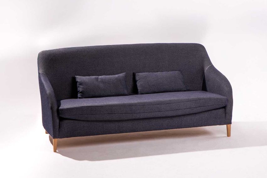 A prototype Lyndal Sofa, blue herringbone wool,97 cm high x 210 cm wide x 84 cm, the seat 51 cm high x 67 cm.