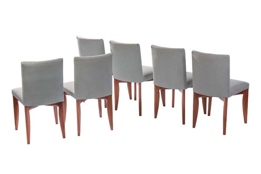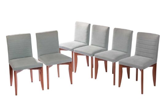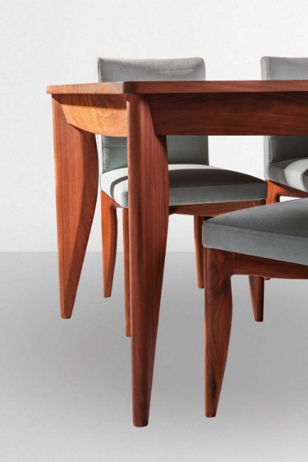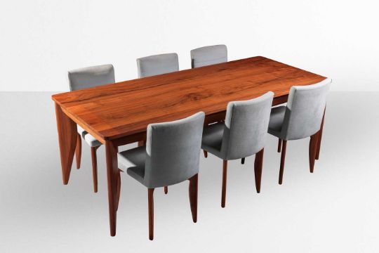 Terence Conran for Benchmark Furniture, a 'Heath' dining table and chairs, the table in American black walnut, 76 cm high x 210 cm x 90 cm, confirming chairs with pale green upholstery, 85 cm high x 48 cm wide, seats 47 cm high.