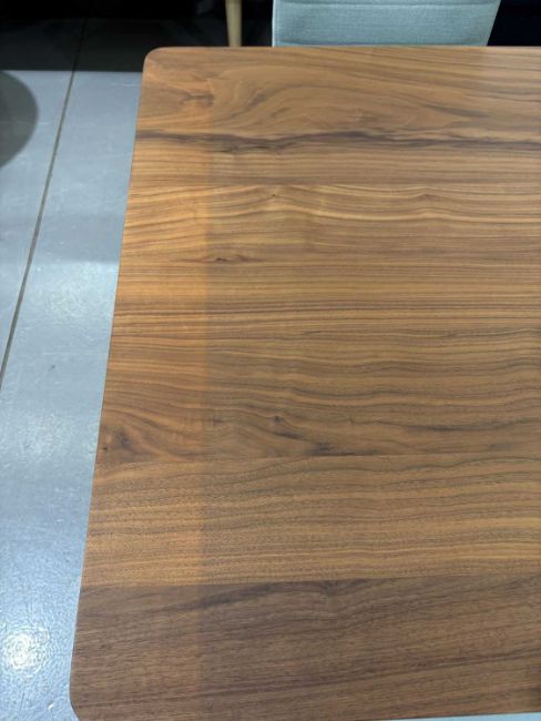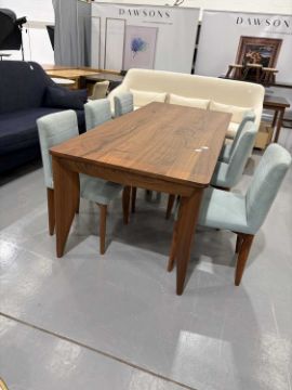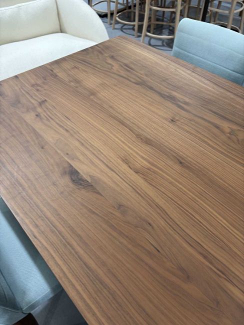All elements in good structural condition - appear unused. Some small scuffs to some chair legs, but nothing significant. One end of the table is lighter in colour, as shown.