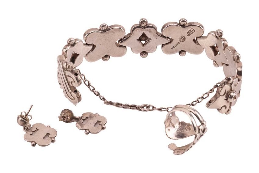 A Taxco bracelet and earrings set, together with a cuff ring; the heavy link bracelet of cross motifs, completed with a pin hinge clasp, stamped with maker's mark for Hector Aguilar, signed Taxco, 17.0 cm in length; with a pair of matching earrings with post and butterfly fittings; and a wing design silver ring, stamped Taxco CBS, size Q; Total weight of items 123.3 grams.