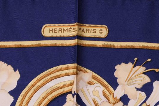 Hermès - 'Caraibes (Caribbean)' silk square scarf in navy, white and gold, designed by Christiane Vauzelles, rolled hem, approximately 90 cm wide.