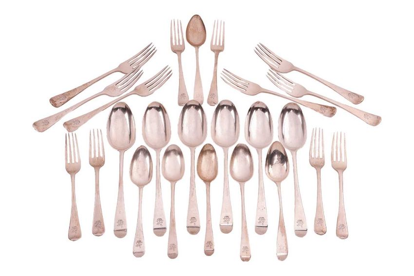 A part mixed canteen of Old English and Hanoverian pattern flatware, with crests engraved to terminals; comprising six tablespoons, London 1770 by John Lampfert, six table forks, London 1806, possibly Richard Crossley, marks obscured, six dessert forks, London 1829, and six dessert spoons, mixed dates and makers. Gross weight 1191 grams, 38.2 ozt