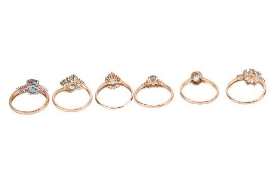 Six 9ct yellow gold dress rings set with pale blue gemstones; to include two blue zircon and diamond dress rings, two topaz and diamond dress rings, and two apatite cluster rings; all British assayed, total weight of items 15.2 grams. (6)