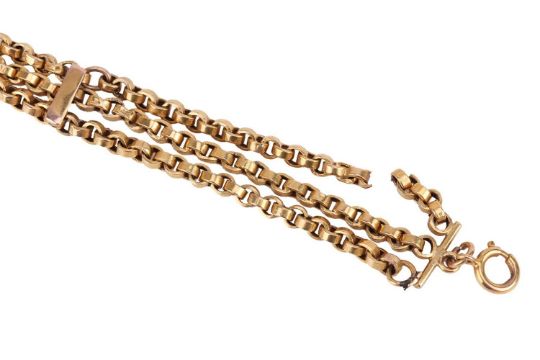 A yellow metal box-link broken watch chain, marked '9c', repair and fittings partially testing as 9ct gold and base metal, 7.9 grams.
