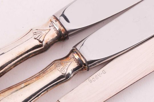 A David Anderson irregular but matching unboxed canteen "Norona" pattern silver plated flatware and cutlery, the set comprising: eight dessert spoons, twelve fish forks, eight fish knives, eight table knives, eight dessert forks, eight soup spoons, twenty-four coffee spoons, eight table forks, eight table knives and a collection of matching serving, sauce and slice type flatware and a non matching heavy cast silver bread fork, by the same hand.