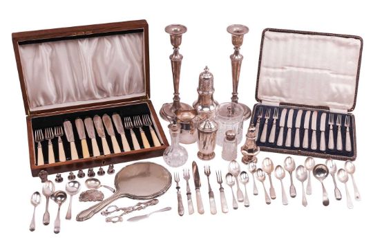 A pair of candlesticks, circular with beaded border and loaded bases, Birmingham 1989, 27cm high; together with a George III style cream jug, London 1912, a large sugar sifter, two further sugar sifters, a set of six fish knives and forks with ivorine handles, a set of six pairs of fruit eaters with silver handles, a set of animal menu holders stamped 'sterling', an Irish silver sauce ladle, a George III caddy spoon and a quantity of other silver, white metal and plated wares. Gross weight weighable 633 grams, 20.3 ozt