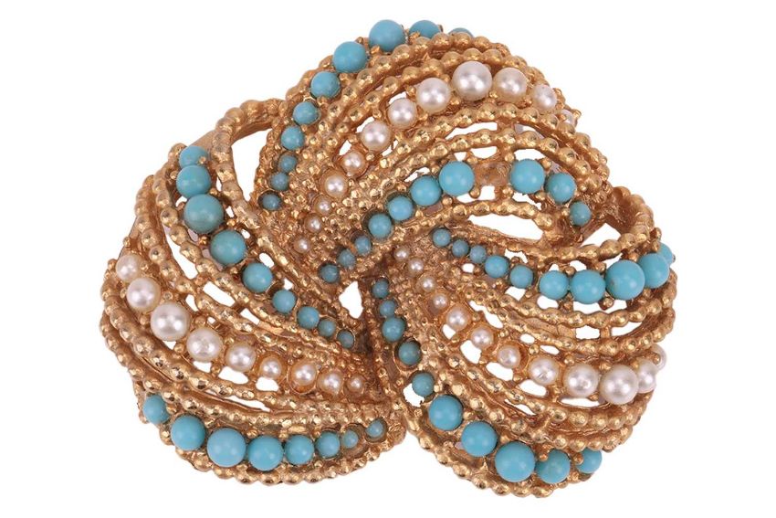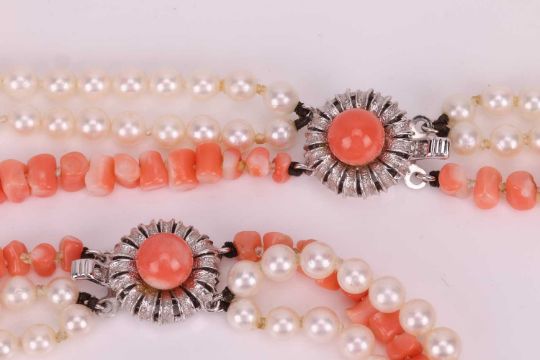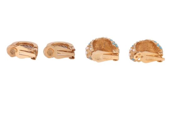 A group of costume jewellery; to include a bangle, brooch and clip earrings suite, set with imitation pearls and turquoise cabochons; a multi-row chain bracelet by Grosse in gilt metal; a pair of bi-colour clip earrings in base metal; and a triple-row necklace and bracelet of coral beads and cultured pearls, with white metal clasps stamped "silver".