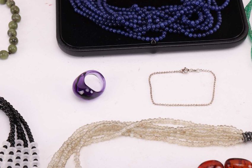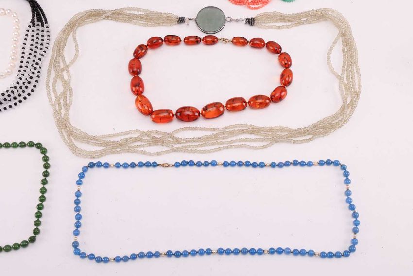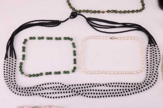 A collection of beaded jewellery; to include a multi-row emerald bead necklace with silver gilt clasp, a necklace of similar design featuring coral beads, a sodalite necklace with a 14ct gold clasp, a murano glass beaded necklace, two cultured freshwater pearl necklaces, three nephrite bead necklaces, a Swarovski ring with box, and other items of jewellery.