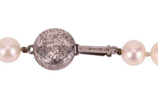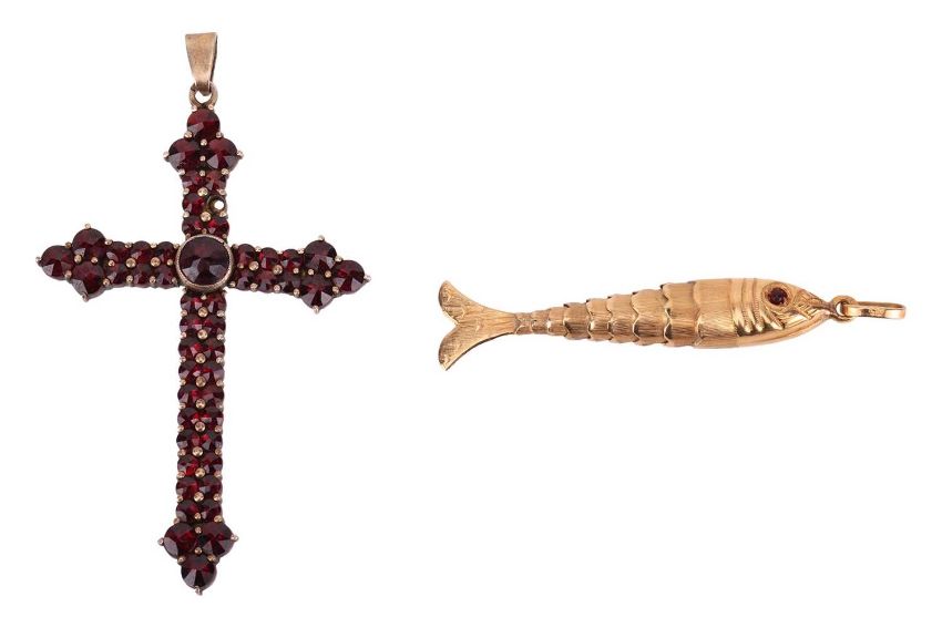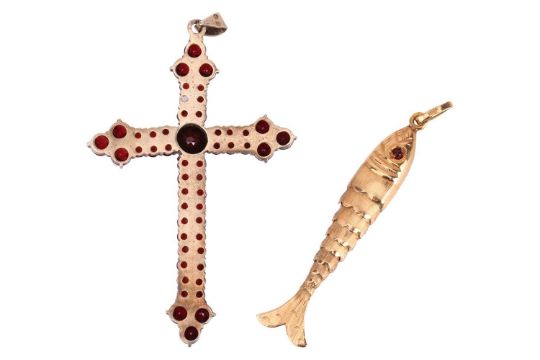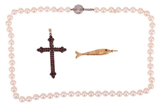 A group lot of jewellery; consisting of an articulated fish charm, textured with gem-set eyes, struck with French assay marks and maker's mark L.F.C with pipe symbol for Levy Franck et Cie, testing as 18ct, 2.7 grams; a garnet-set cross pendant, one stone deficient, marked '900'; and a single strand of cultured pearl necklace, with off-round white pearls of 7.5 mm, hand-knotted to a round clasp stamped '925', would recommend re-stringing, 48.0 cm long. (3)