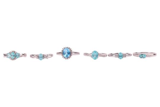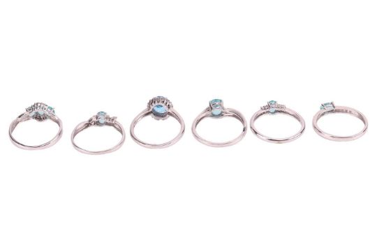 Six 9ct white gold dress rings set with greenish-blue gemstones; to include five apatite and diamond dress rings, and a Swiss blue topaz and diamond halo ring; all British hallmarked, total weight of items 15.2 grams. (6)