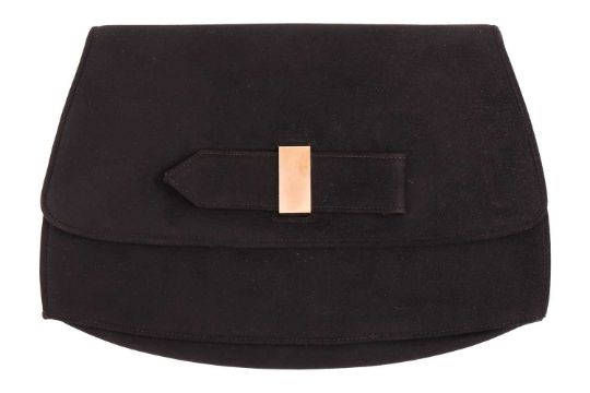 Cartier - an evening clutch bag in black suede, circa 1960s, of rounded rectangular shape with gussets to the sides, flap closure, lined with black silk, multiple compartments with a fitted mirror and fitted detachable envelope pouch, signed 'Cartier Ltd. London', gold-tone hardware. W26.0 x H17.0 cm.
