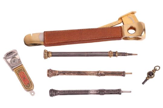 A Victorian gold-plated telescopic pencil with foliate engraved decoration and a white agate set to the terminal; together with a silver engine-turned telescopic pencil, Birmingham 1904 and a further telescopic pencil marked 'Extra strong London', possibly by Morley and Co and set with a carnelian to the terminal; two cigar cutters and a gem-set watch key. (6)