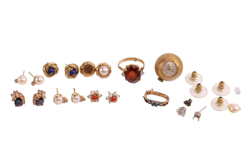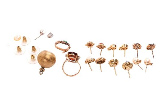 A pair of sapphire and diamond earrings, the oval cut diamonds within a surround of baguette and round brilliant cut diamonds, with post fittings; together with a garnet and diamond dress ring, an emerald and diamond hinged oval necklace clasp, (two diamonds deficient); a pair of pearl and three stone diamond earrings; a pair of 18 carat gold and split pearl earrings; a pair of 9 carat gold and lapis lazuli knot earrings; a pair of single stone aquamarine earrings and a small quantity of other jewellery. Gross weight weighable 17.9 grams.