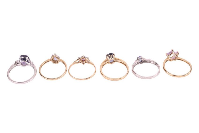 Six rings in 9ct gold set with purple gemstones; to include a star-cut amethyst solitaire in size S, an amethyst of greyish-purple colour between diamond-set shoulders in size S½; another similar in size S½, a pear-cut tanzanite and diamond halo ring in size S, a sapphire and CZ dress ring in size S, and an amethyst daisy head cluster ring in size S; all struck with British hallmarks, total weight of items 11.6 grams. (6)