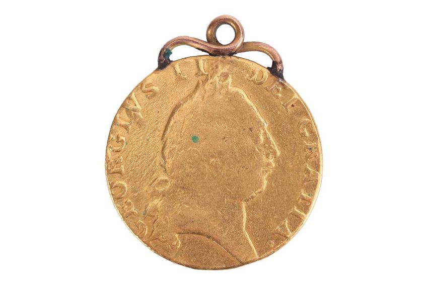 A George III 1790 Gold Spade Guinea, with applied mount. 8.3 grams, 24 mm diameter.