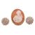 A cameo ring, featuring a central oval cameo of 25mm x 19mm, depicting a female figure carrying a foliate form, to a yellow metal mount bordered with twisted wire detail, to bifurcated shoulders and a 9ct yellow gold ring shank, size P, 6.8 grams; Together with a pair of white sapphire cluster earrings, each cluster featuring nineteen round-cut white sapphires, to screw-post fittings, a screw back and one butterfly back, base metal. (2).