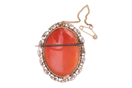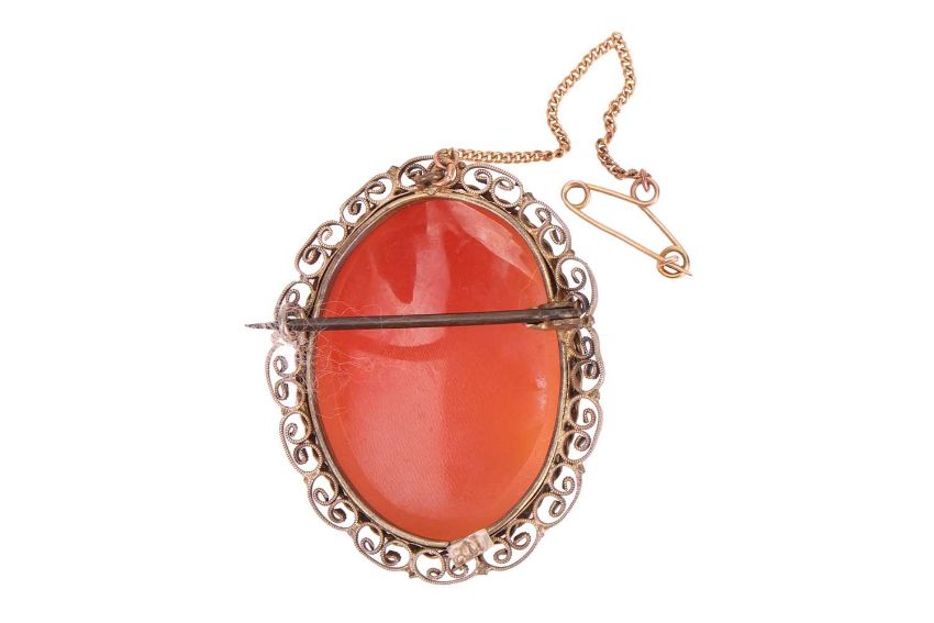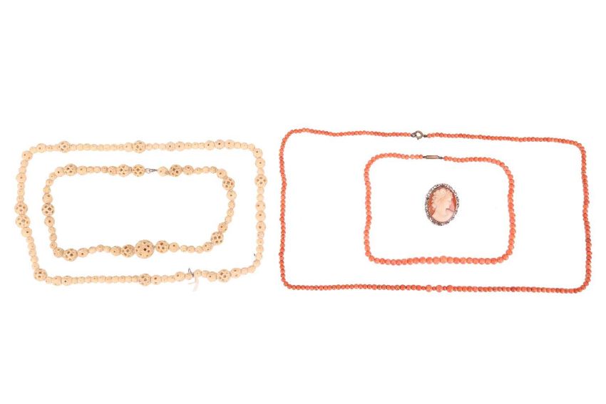Two coral bead necklaces, an oval shell cameo of a lady in a gilded white metal frame, and two carved bone bead necklaces. (5)