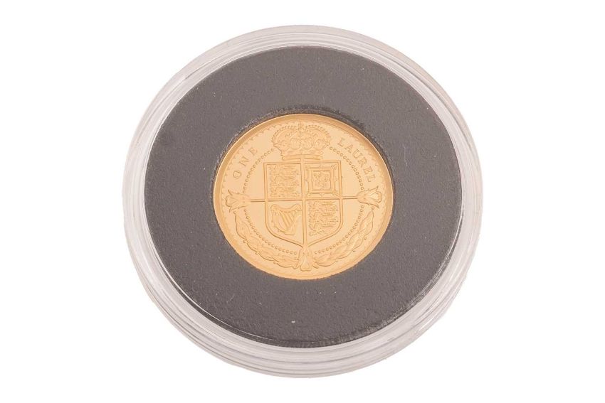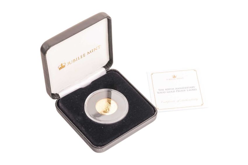 A Charles III 2025 400th Anniversary Gold Proof Laurel, in capsule, with Jubilee Mint box and certificate of authenticity, limited edition of 599.