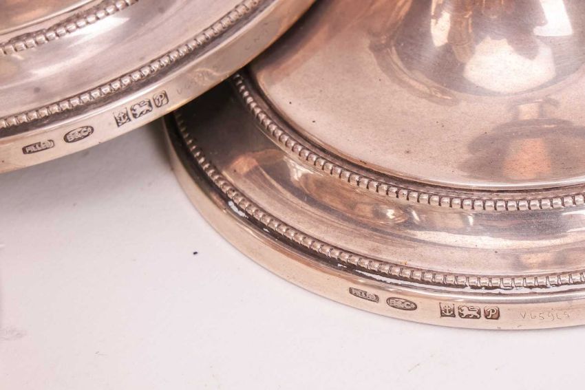 A pair of candlesticks, circular with beaded border and loaded bases, Birmingham 1989, 27cm high; together with a George III style cream jug, London 1912, a large sugar sifter, two further sugar sifters, a set of six fish knives and forks with ivorine handles, a set of six pairs of fruit eaters with silver handles, a set of animal menu holders stamped 'sterling', an Irish silver sauce ladle, a George III caddy spoon and a quantity of other silver, white metal and plated wares. Gross weight weighable 633 grams, 20.3 ozt